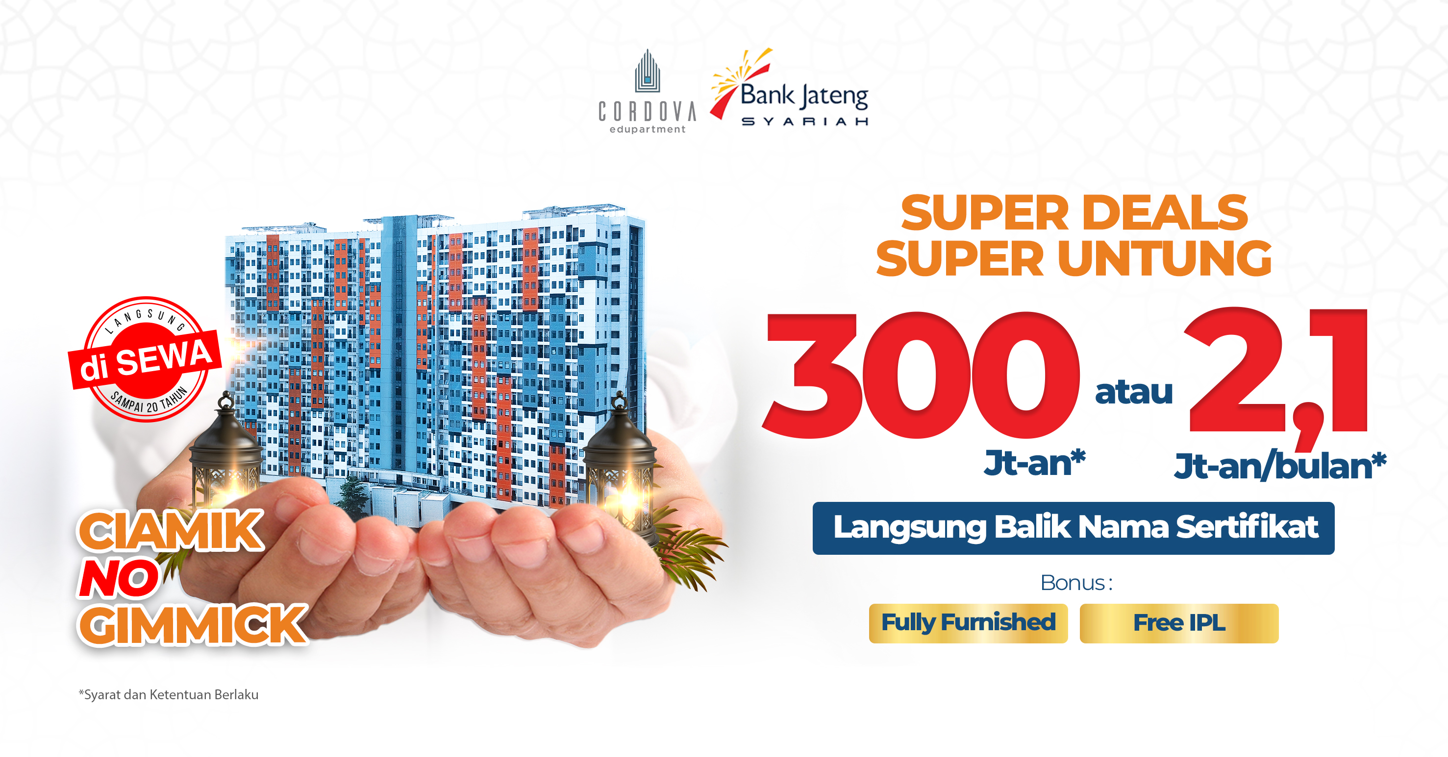 Melalui kerja sama ini, calon pembeli Cordova Edupartment dapat menikmati harga spesial yang hanya khusus tersedia melalui skema pembiayaan Syariah dari Bank Jateng Syariah. Program ini memberikan berbagai keuntungan, antara lain: